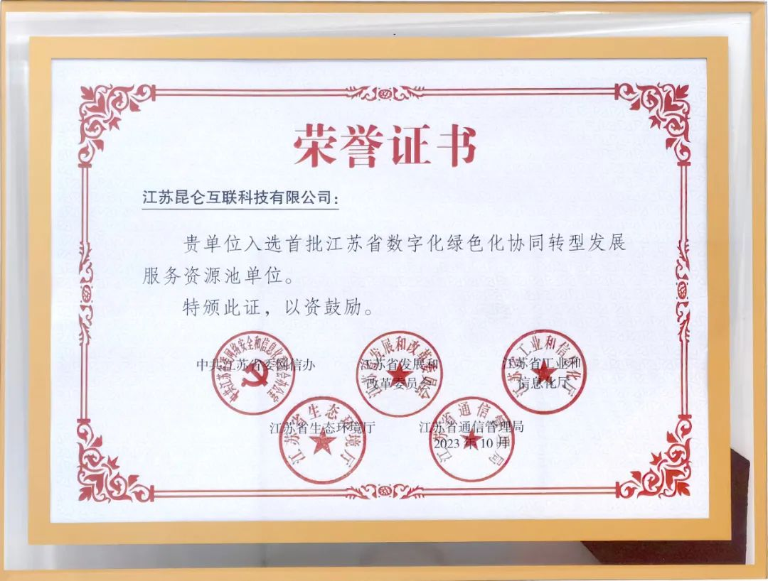 为贯彻落实党中央、国务院关于碳达峰碳中和、数字中国建设重大决策部署以及江苏省委、省政府有关工作要求,加快推进全省数字化绿色化协同转型发展(以下简称“双化协同”)。近期,江苏省委网信办会同省发展改革委、省工业和信息化厅、省生态环境厅、省通信管理局联合组织开展了江苏省“双化协同”服务资源池单位征集活动。经各地各有关部门推荐、形式审核、专家评审和综合审议,遴选了60家服务商单位。昆仑互联通过评审成功入选首批“江苏省数字化绿色化协同转型发展服务资源池”。
