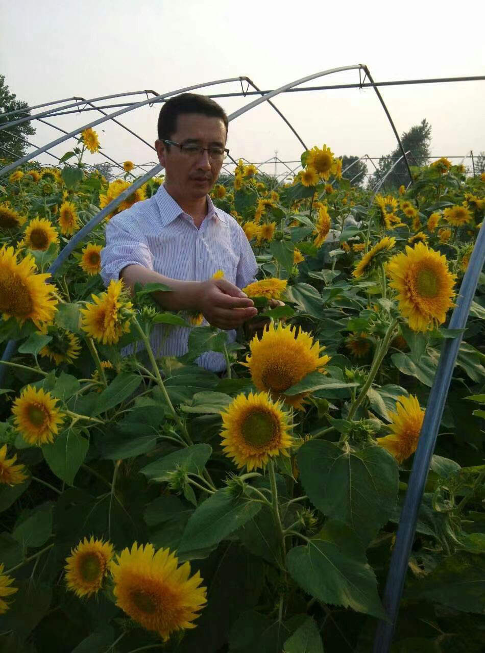 葵花学科作为省内新兴学科,一直面临科研人员和经费不足、经验少、试验地经常搬迁等问题,所以戚永奎凡事都自己动手,在栽培管理、土壤改良、病虫害防治等各个方面亲自实践和摸索,学做“全科农业专家”。夏季,无论天气多么炎热,你总能看到他带领他的团队在田间选种的身影;春节放假期间,他自己一个人在工作室对数千份种子进行仔细鉴定和选种。他创新葵花三元杂交制种技术,极大地丰富了葵花的花色和花型,创新葵花“一年两熟种植技术”和“一圃制”葵花种子繁殖技术,大大缩短了葵花育种年限,实现我省葵花育种学科弯道超车、后者居上,也极大地提升了葵花在休闲观光农业中的应用前景。他 12 年种出 24 季葵花,建立和服务基地 150 多个点次,为基地和园区创造经济效益 5 亿多元,带动就业 120 多人,带动消费10 多亿元。为了关心下一代,他多次深入中小学和幼儿园孩子们中间举办“一举夺魁”和“童心向党,葵花向阳”主题活动,引导孩子们从小热爱农业,未来服务农业。