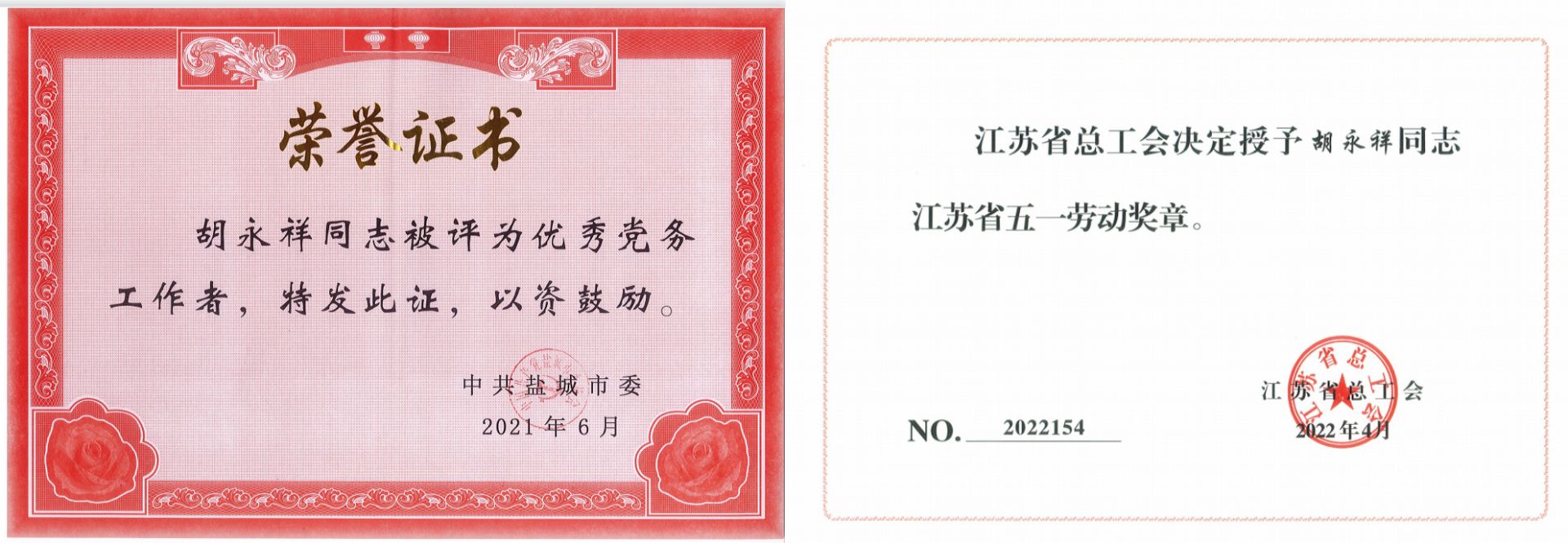 胡永祥今年 57 岁,先后担任市铁投公司党支部书记、工程运维部部长、工会主席,市交投集团总工办主任等职务。先后获得江苏省交通运输行业“两聚一高”擎旗手、盐城市五一劳动奖章、盐城市优秀党务工作者、江苏省五一劳动奖章等荣誉。