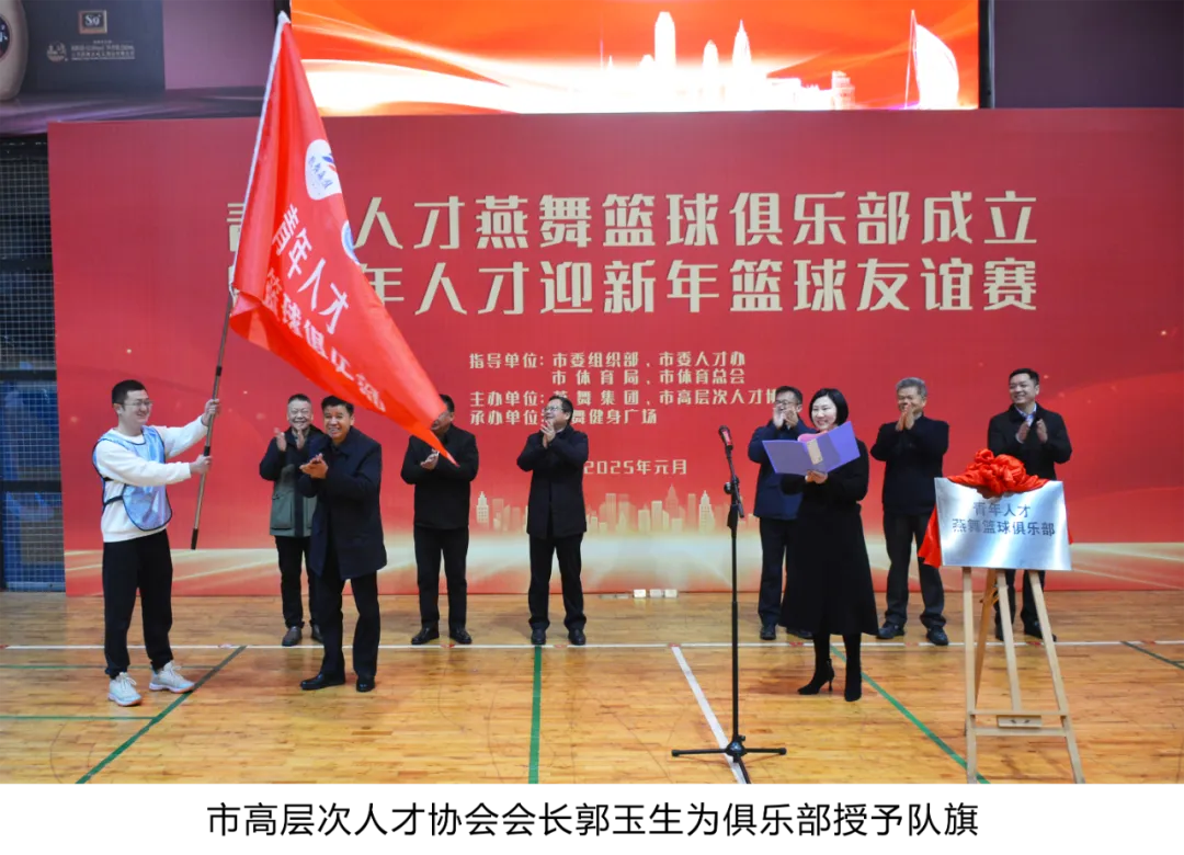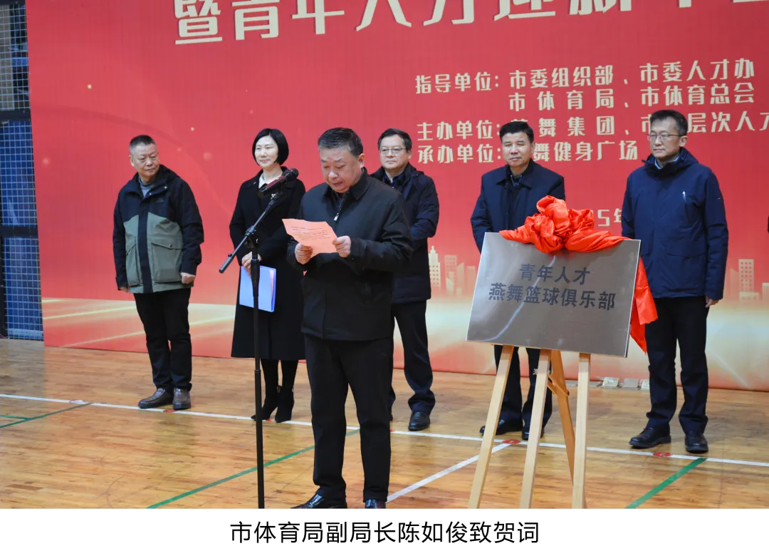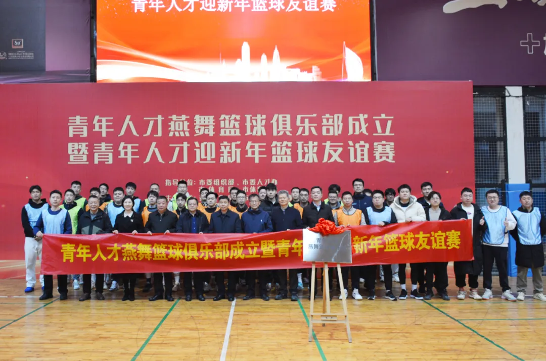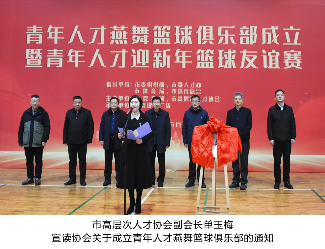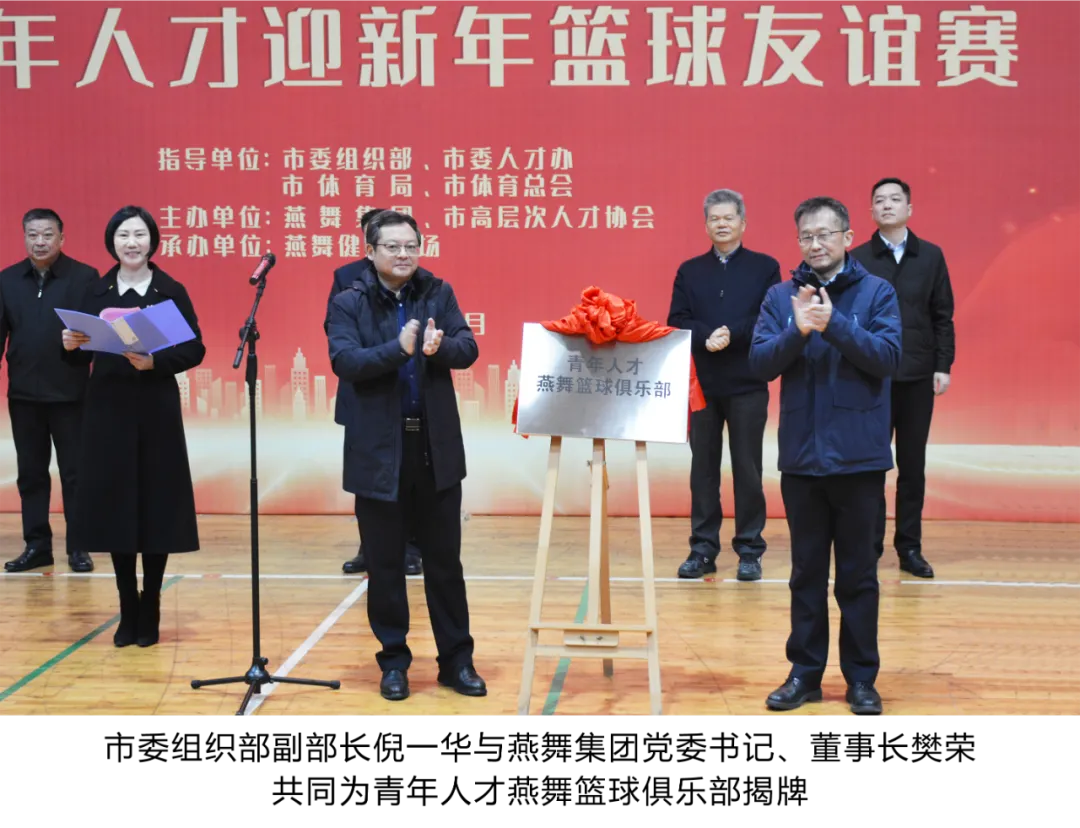 为丰富青年人才业余生活,增进青年人才之间的交流和友谊,1月4日上午,由盐城市委组织部、市委人才办、市体育局、市体育总会指导,燕舞集团、市高层次人才协会主办的青年人才燕舞篮球俱乐部成立仪式暨青年人才迎新年篮球友谊赛在燕舞健身广场成功举办。市高层次人才协会会长郭玉生, 市委组织部副部长、市委人才办副主任倪一华,燕舞集团党委书记、董事长樊荣,市体育局三级调研员、党委委员、副局长陈如俊参加活动,市高层次人才协会副会长单玉梅主持活动。