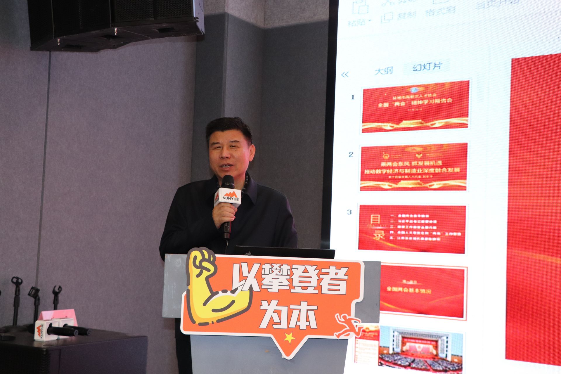 为认真学习宣传贯彻落实全国“两会”精神,激发广大高层次人才奋进新征程、建功新时代、创造新业绩,3月27日下午,盐城市高层次人才协会举办全国“两会”精神学习报告会,邀请第十三届、十四届全国人大代表、市高层次人才协会副会长、昆岳互联环境技术(江苏)有限公司董事长刘怀平,为协会理事及青年人才分会成员,作《乘两会东风 抓发展机遇 推动数字经济与制造业深度融合发展》主题宣讲。市高层次人才协会会长郭玉生主持会议,并作总结讲话。