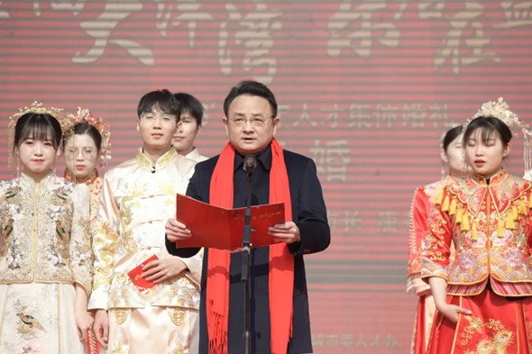 跨火盆、跨马鞍、饮合卺酒……2月5日是有着“中国情人节”之称的元宵节,28对新人选择在这一天参加由中共盐城市委组织部、中共盐城市委人才办、盐城市妇女联合会主办,盐阜大众报报业集团、燕舞集团承办的“幸福大洋湾·乐居在盐城”2023’青年人才集体婚礼暨相亲会活动,以文明简约而又热烈浪漫的方式汇集各方祝福,分享美好心情,留下难忘回忆。市政府副市长唐敬出席活动并为新人证婚。